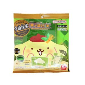 宇治抹茶味のパフ入りチョコレートとホワイトチョコレートを合わせた、宇治抹茶味の準チョコレートです。甘みと苦みのバランスがよく、5袋入りで、1袋ずつ楽しめます。サンリオキャラクターズのデザインが入ったチョコレートで、全15キャラクター、全20種のデザインがそろっています。